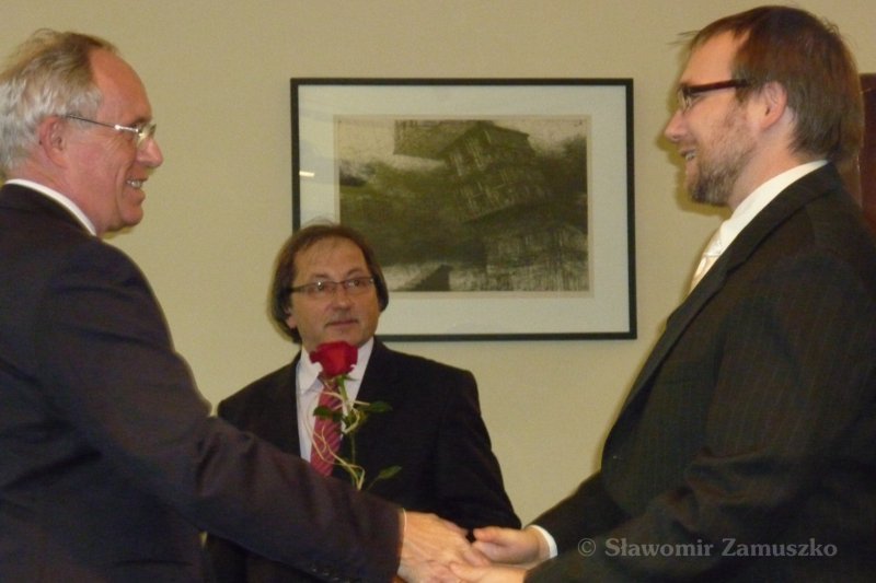 Z prof. drem hab. Tadeuszem Miczką, Jego Maginificencją Rektorem Akademii Muzycznej im. Karola Szymanowskiego. Promocja na stopień naukowy doktora habilitowanego, Katowice 15.10.2014.